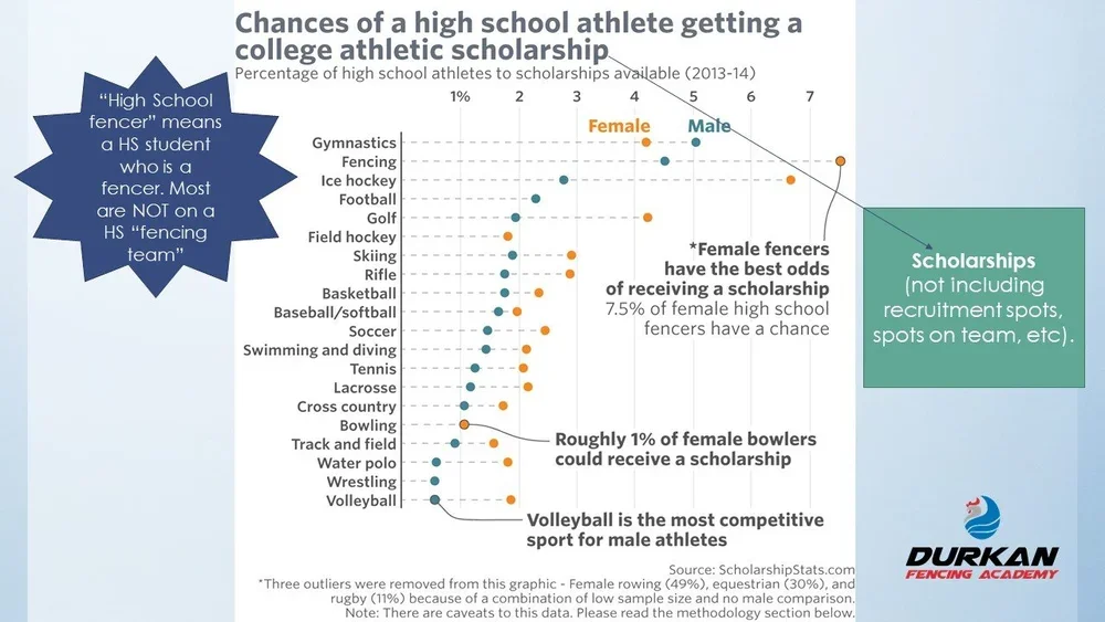 Fencers have an excellent chance of getting a college scholarship (see graph below). In addition, fencing is a highly recruited talent for Ivy League Schools. Ivy League Schools cannot give athletic scholarships, but they do offer recruitment spots to top athletes every year.