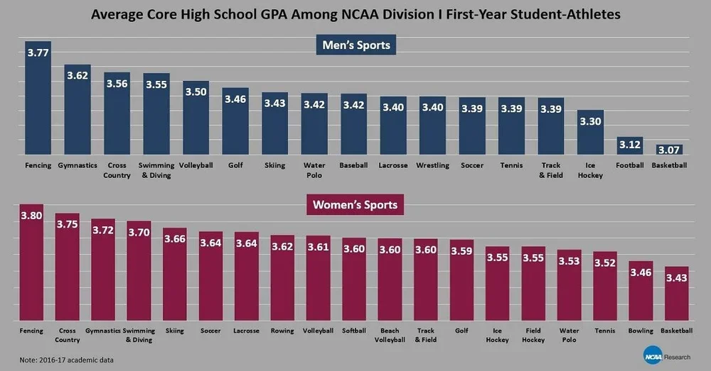 Fencing athletes have the highest average high school GPA (3.77 men, 3.80 women), with basketball and football lowest among men, and bowling/basketball lowest among women.