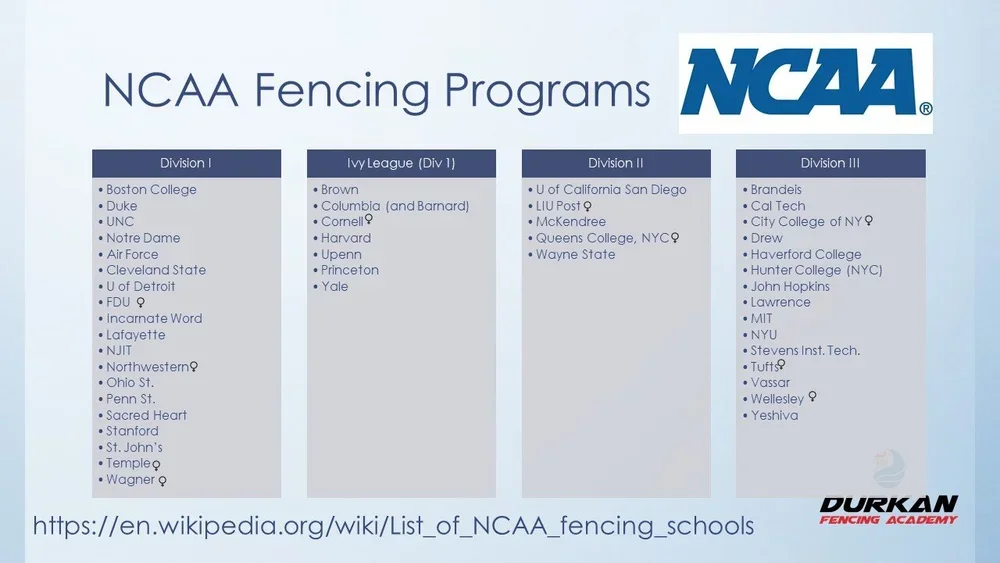 Lists Division I, Ivy League, Division II, and Division III colleges with fencing teams, including schools like Harvard, Notre Dame, Stanford, Columbia, and MIT.