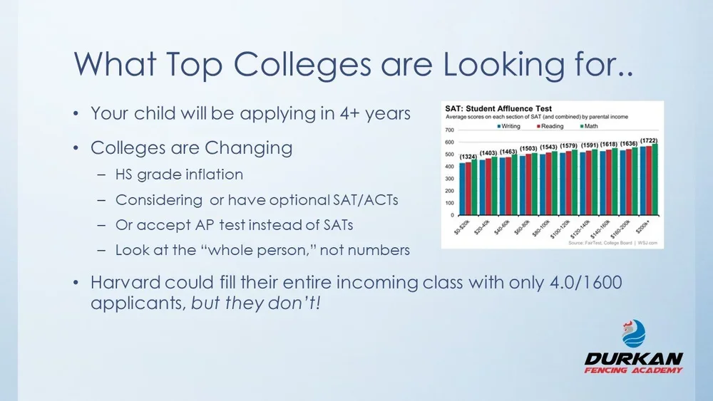 Durkan Fencing Academy is very experienced with the college admissions and the NCAA recruitment process. Patrick Durkan was a recruited fencer to both Harvard and Columbia Universities (He graduated from Columbia). Amy Durkan is a graduate of Cornell University with a Master’s Degree from Columbia. Together, the have years of experience in elite college recruiting. Our highly educated team is here to guide you through the process.